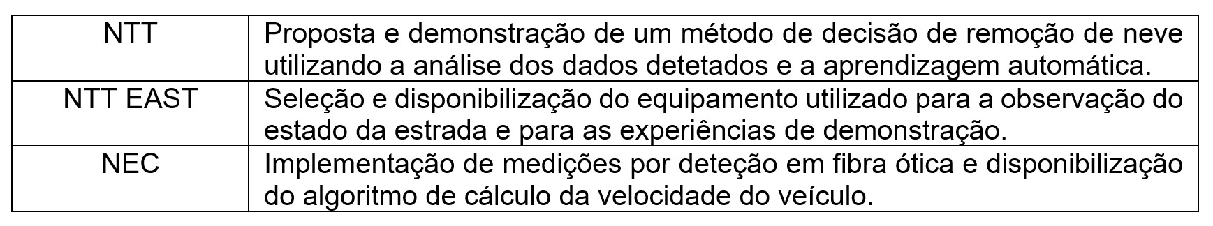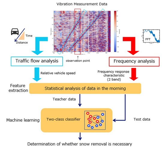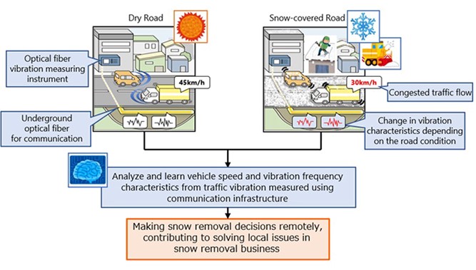 Nestas circunstâncias, a melhoria da eficiência através da DX é uma questão urgente. Em resposta a este desafio regional, as três empresas realizaram uma experiência de demonstração para determinar a implementação da remoção de neve. Em primeiro lugar, combinaram o algoritmo de deteção de velocidade de veículos da NEC com o método proposto pela NTT de análise da correlação entre a necessidade de remoção de neve e as características de vibração provocadas pelo tráfego na fibra ótica. Esta combinação foi feita com dados sobre a vibração do tráfego nas estradas da cidade de Aomori, obtidos através de fibra ótica subterrânea não utilizada, instalada pela NTT EAST e da tecnologia de deteção de vibração em fibra ótica fornecida pela NEC.